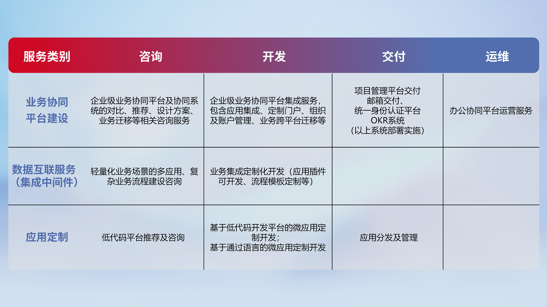 针对钉钉、、、、企微、、、IDaas等平台级产品提供产品的规划、、、方案、、交付、、、定制化开发等服务,,,,实现如统一协同办公、、智能客户服务、、、、混合会议管理、、、、智能数据查询、、等业务场景,,,,实现数字化转型。。。