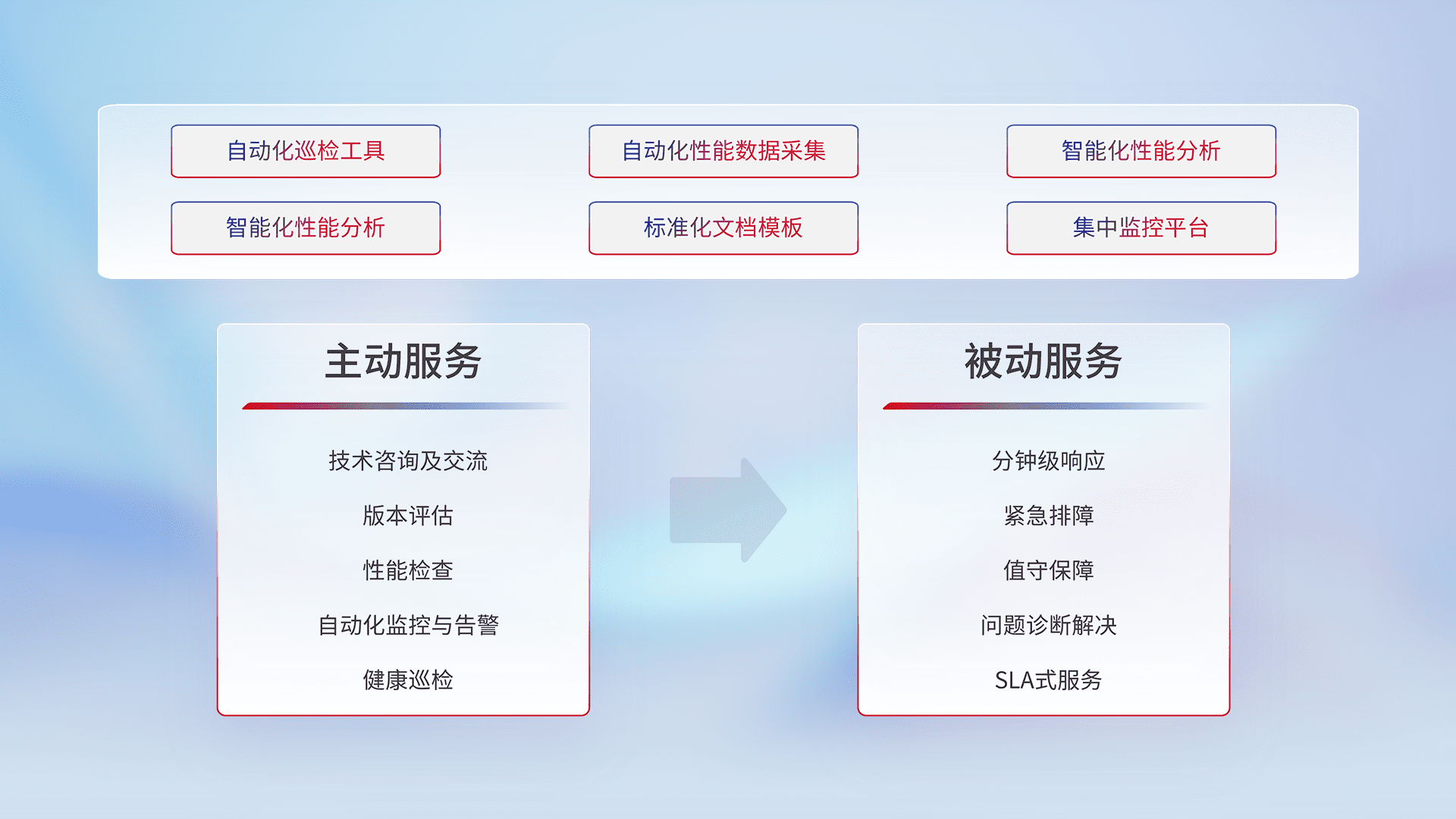 智能化工具和标准化文档,,,,保障服务质量,,,提供主动服务(包含技术咨询、、、版本评估、、性能检查、、、、自动化监控与告警、、、健康巡检)和被动服务包含(分钟级响应、、、紧急排障、、、值守保障、、问题诊断解决、、SLA服务)。。
